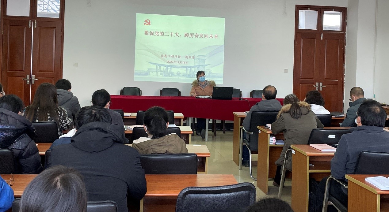党委书记周亚芳在德业楼406会议室,以“数说二十大,踔厉奋发向未来”为题,给全院教职工宣讲党的二十大精神。她介绍了党的二十大整体情况,并对二十大报告的“112233556”,即“中心任务、第一要务,两步走、两个行,三个务必、三件大事,五项原则、五个必由之路,六个坚持”等要点等做了详细分析,提出要按照“五个牢牢把握”“七个聚焦”的要求全面深入贯彻落实党的二十大精神。