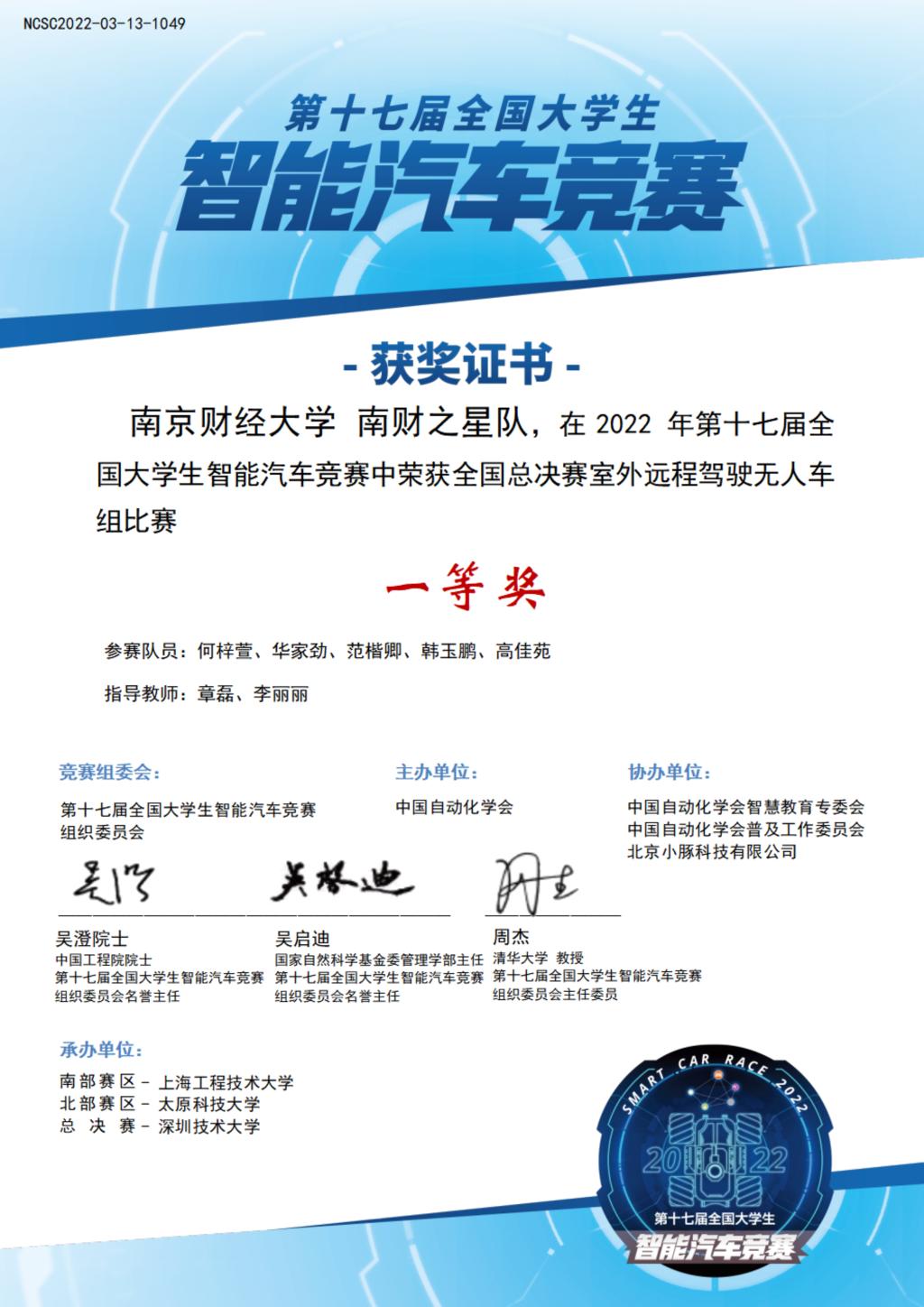 何梓萱、华家劲、范楷卿、韩玉鹏、高佳苑等5名学生组成的“南财之星”代表队斩获“室外远程驾驶无人车”比赛一等奖。学院章磊、李丽丽老师获得优秀指导教师奖。同时,该团队在2022年中国大学生计算机设计大赛、中国机器人大赛等比赛中获得国家级二等奖1项、三等奖2项。