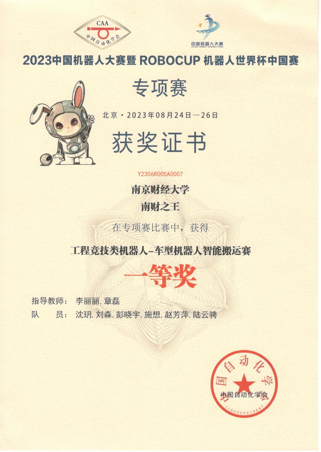 沈玥、刘森、彭晓宇、施想、赵芳萍、陆云骋组成的“南财之王”队在指导老师李丽丽、章磊的精心指导下,经过激烈角逐,斩获工程竞技类机器人-车型机器人智能搬运赛一等奖。同时,该团队在2023年(第16届)中国大学生计算机设计大赛国赛中斩获二等奖、在2023年(第十届)江苏省大学生计算机设计大赛暨中国大学生计算机设计大赛江苏省赛中斩获二等奖、在2023年全国大学生电子设计竞赛江苏赛区比赛中斩获二等奖。