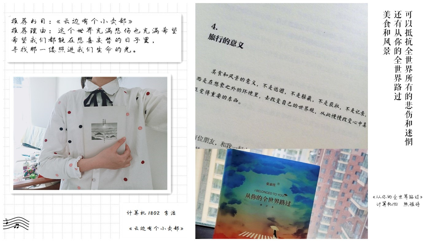 学生会为大家组织了一场主题为“云间赏书”的线上读书分享会,许多同学都在线分享他们心目中的好书籍。这些书籍有小说、散文,也有专业学习书籍,每个人都能在书中找到与自己心灵契合的点。参加读书分享会的软件1801班裴盈盈同学说:“读万卷书行万里路,疫情防控期间也许我们没法走出家门探寻世界,但书籍是我们最好的无声朋友,通过阅读我们也可以阅览世界。”疫情期间,读一本好书,可以说是多了一位知心的伙伴,让同学们在沉闷的生活里透进春日的暖阳。
