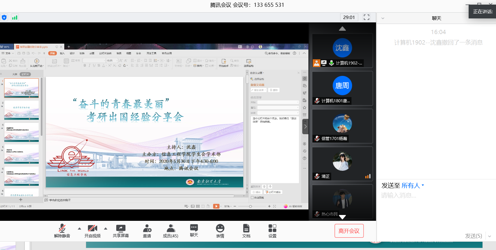 组织下,“奋斗的青春最美丽”考研出国经验线上分享交流会成功举办。本次会议旨在帮助同学们进一步了解考研和出国方面的经验,为有需求的同学们提供交流机会,特别邀请到2016级优秀毕业生吴皖蒙,周恒以及方泽强来给在校生们作经验分享。