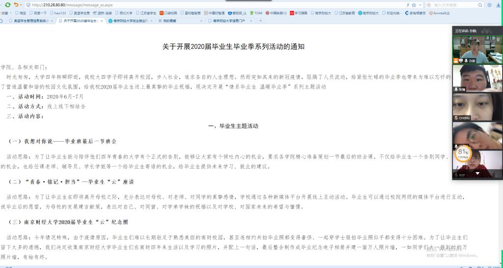 会议最后,孙脉老师给各位班委说明了返校办理毕业手续的相关事宜和毕业季的一系列活动,彼此表达了深切的思念。希望大家都能平安顺利的返校办理手续的同时,也衷心祝愿大家都能够前程似锦!