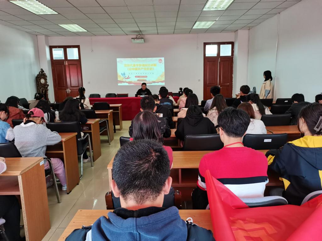 党员李梦倩同学向同学们讲解了习近平同志的《论中国共产党历史》以及五四运动的内容、意义,点明五四运动所孕育的五四精神由爱国、进步、民主、科学组成。李梦倩同学指出当今青年运动的主题和方向是坚持中国共产党领导,同人民一道,为实现“两个一百年”奋斗目标、为实现中华民族伟大复兴的中国梦而奋斗。她结合社会热点及时事说明青年人的具体做法,激发了同学们的爱党爱国热情。