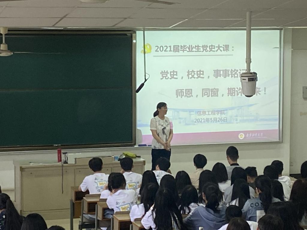 党史大课上,周亚芳书记结合党史、校史,从中国共产党成立100周年大事记开始,以恽代英、张思德、袁隆平等人为例,强调青年学生要坚定理想信念,敢于有梦,勇于追梦,勤于圆梦,更要具备“精神”,即奋斗精神、创新精神、团队精神以及奉献精神;通过自己的努力尽快融入社会,用自身所学为社会经济发展服务,在未来工作岗位上做出一流业绩。临别之际,她希望同学们能心怀母校,关心母校发展,常回母校看看。作为学生政治辅导员,她还叮嘱党员毕业生们要不忘初心,牢记自己的使命与担当,不断学习,勤于实践,为实现中华民族伟大复兴的中国梦而努力奋斗。
