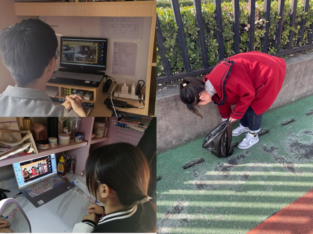 的部分志愿者走出宿舍、走过校园的角落,弯腰捡拾垃圾,为美化校园环境贡献力量。