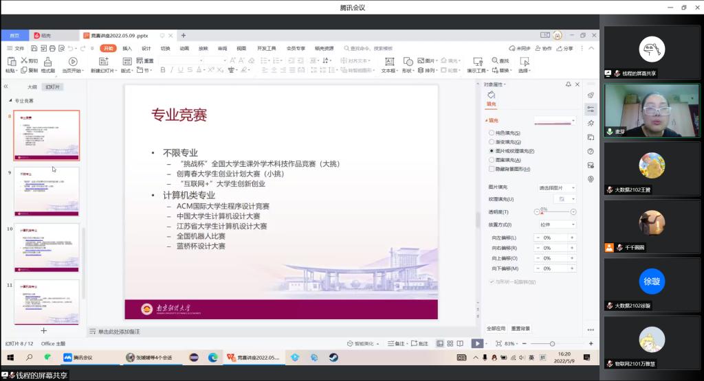孙脉老师首先将大学生学科竞赛分为基础学科类和专业学科类竞赛,分门别类的将各个比赛的性质、特点、级别以及我校举办该比赛的流程和注意事项;随后孙脉老师结合自己多年学生辅导员以及参赛指导老师工作经验,向大家说明比赛过程中的重点和难点,她强调要拥有一颗充满热情的心去参加比赛、享受比赛,不要惧怕,也不要妄自菲薄;最后孙脉老师将以往参赛过的优秀学子所取得的成绩与大家分享,让同学们收获颇丰。
