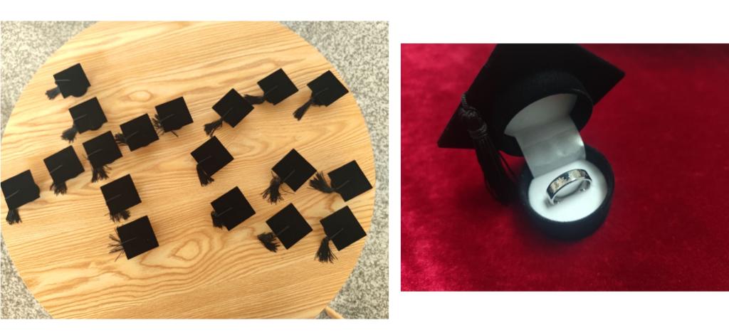 戒指,有盟誓之意。毕业戒指,是信物,是羁绊,是对南财信工院的留恋,是承载着青春岁月的信物,也是践行校训精神的承诺。小小硕士帽里的戒指外圈刻着的哔咔漫画