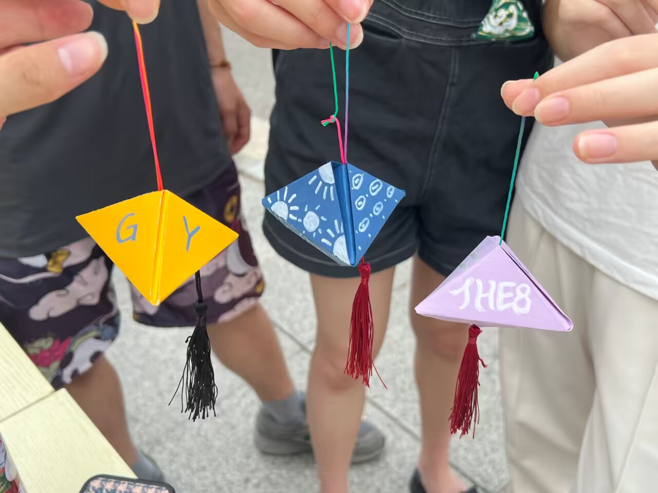 现场,同学们相互学习,相互交流,共话端午习俗,感受节日氛围。完成纸粽后,志愿者与同学们一起在纸粽上系好流苏制成香囊挂饰,用画笔等工具美化,留下心中对端午的美好印象与憧憬。同时志愿者指引同学们进行套圈或投壶,套圈成功或投壶投进一定数量后获取精美奖品。在制作纸粽过程中,各个小组讨论想法,竞争比赛,分析投票,最后选出最受欢迎的一组纸粽作品。