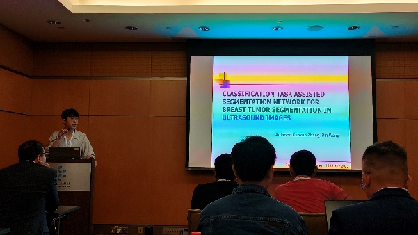 2022级硕士生张坤坤(指导教师:王斌教授)受邀参加了此次会议,做了题为“CLASSIFICATION TASK ASSISTED SEGMENTATION NETWORK FOR BREAST TUMOR SEGMENTATION IN ULTRASOUND IMAGE(用于乳腺肿瘤超声图像分割的分类任务辅助分割网络)”的口头报告。