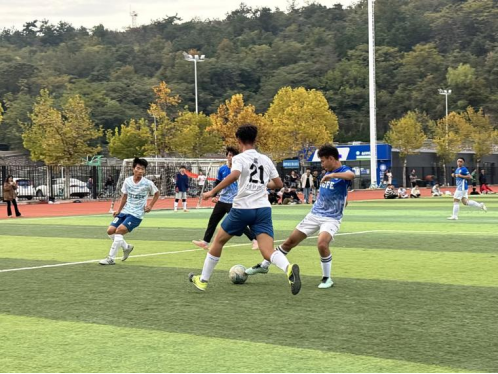 “新生杯”男子足球赛在中苑操场进行,本场比赛双方为信息工程学院和国际经贸学院。