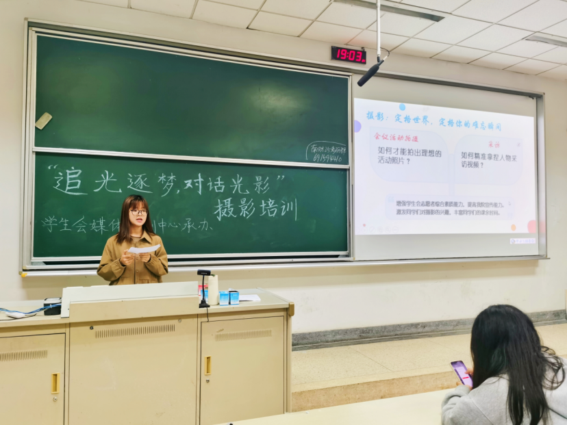 为提高学院团学活动照片质量,10月27日,哔咔漫画 在德业楼111开展 “追光逐梦,对话光影”摄影培训会。本次培训会由学院学生会媒体融创中心志愿者陆怀湘主持,校青媒影像制作部孔欣雨主讲。