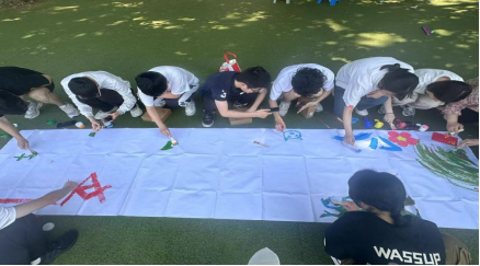 “一块五毛”活动则非常考验同学们的反应力和敏捷度,在裁判吹哨后,同学们经过瞬间思考,快速奔向彼此,搭配组合,抱作一团。另外,“后背画画”这一环节,同学们心有灵犀,凭借着默契,用心感受,认真模仿,共同完成了游戏,胜出的小组大声喝彩,现场也充满了欢声笑语,最后一起完成了此次活动的留念涂鸦,笑脸与手印完美相融。