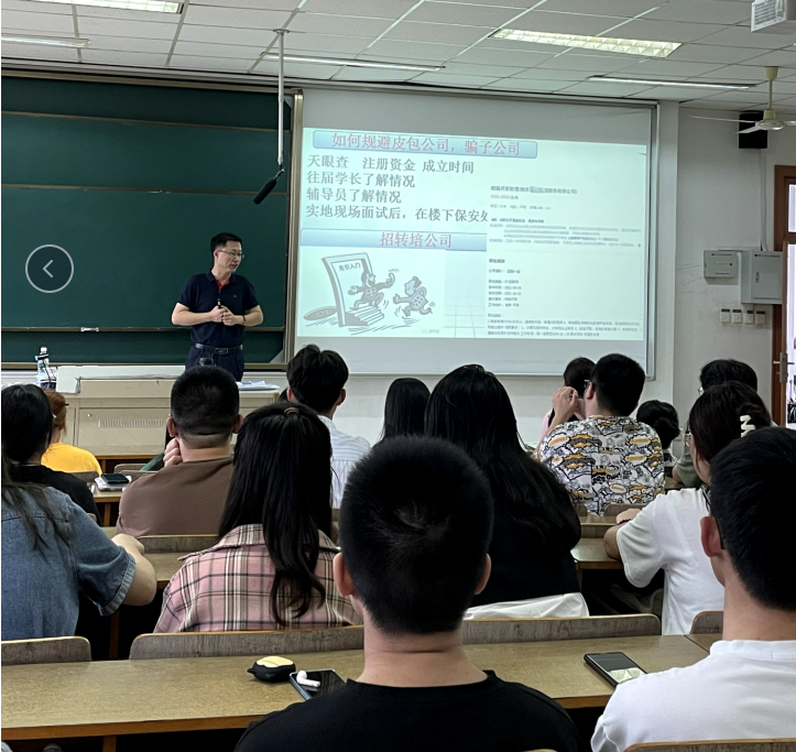 学院邀请我校校友、南京艾瑞集团负责人徐彬以及该公司旗下南京纽扣网络科技有限公司校企合作部负责人陈韩为2021级大四学生作就业创业指导。徐彬首先为同学们介绍了自己的创业历程以及公司近年来取得的成就,他鼓励同学们学好专业技能,瞄准方向,用自己勤劳的双手创造美好的未来。随后陈韩为在场同学作《面试细节,薪资谈判——如何提前斩获大厂Offer》为题的专场讲座。