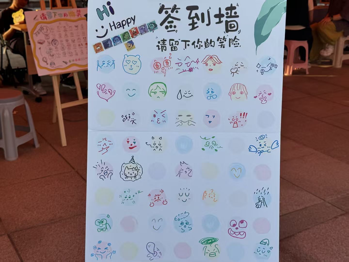 活动分为“笑脸签名留念”、“南财表情包解析”、“VR技术体验”三个环节。在“笑脸签名留念”环节,学生在签名板上绘制个性化表情符号,通过艺术表达记录当下心境,最终形成展现当代大学生精神风貌的集体创作成果;在“南财表情包解析”环节,学生通过辨识AI生成的校园主题表情包,深入理解设计理念与校园文化内涵,强化对学校的认同感,进一步增强荣校爱校意识;在“VR技术体验”环节,学院提供专业VR设备供学生体验,并设置实践操作区。参与者通过亲手制作简易VR眼镜,掌握基础技术原理,实现科技素养与心理调适能力的同步提升。