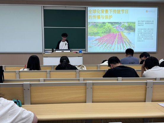 在成果汇报中,各小组代表通过PPT展示、情景演绎、互动问答等多元形式呈现研讨成果。其中第三小组以“端午符号的现代转译”为题,对比 “龙舟竞渡→体育竞技”“五彩绳→时尚饰品”等案例,阐释传统习俗的创新路径;第九小组则以“全球化传播中的文化自信”为主题,播放自制的多语种端午文化短视频,展现跨文化传播的可行性。