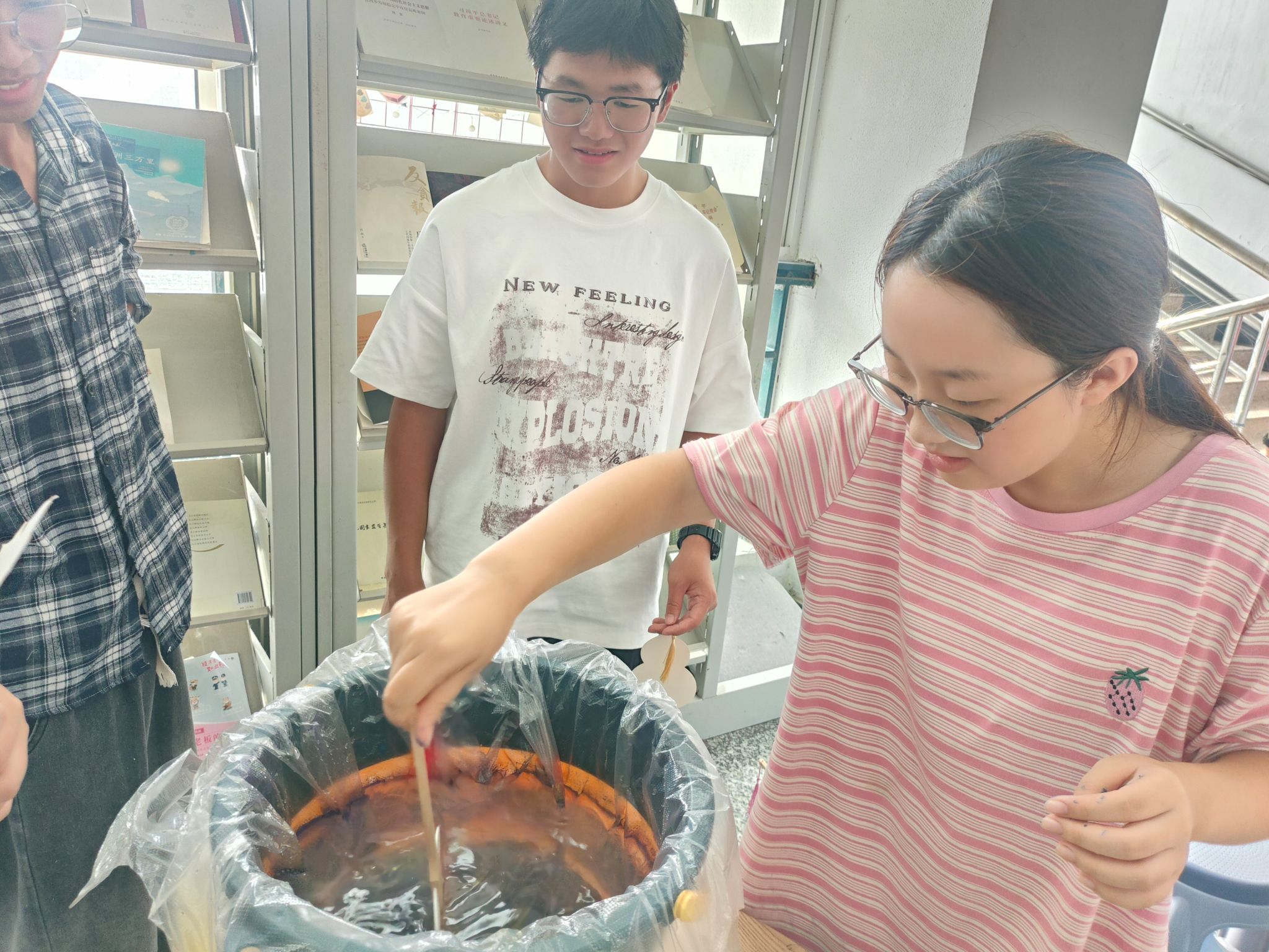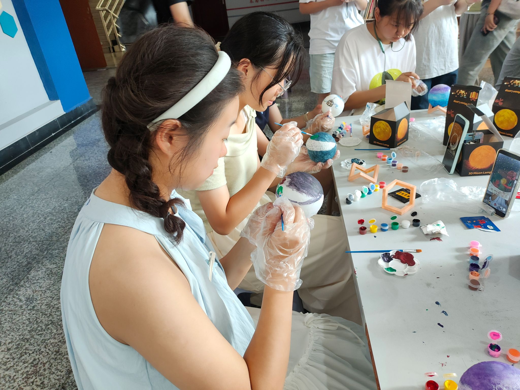 活动现场,同学们悉心调配颜料,将色彩滴入水中,再以巧思引导扇面与液体交融——转瞬之间,一幅幅流动而独一无二的纹样便跃然扇上,中秋意蕴与非遗技艺完美融合。另一侧,大家俯身勾勒,笔尖点亮盏盏月球灯,绘出心中最美的团圆图景。尽管来自不同地域、不同班级,但在水色与光影交织的创意空间里,彼此的距离悄然拉近。每一把独具匠心的漆扇、每一盏温暖明亮的月球灯,都成为同窗情谊与团结共识的生动见证。