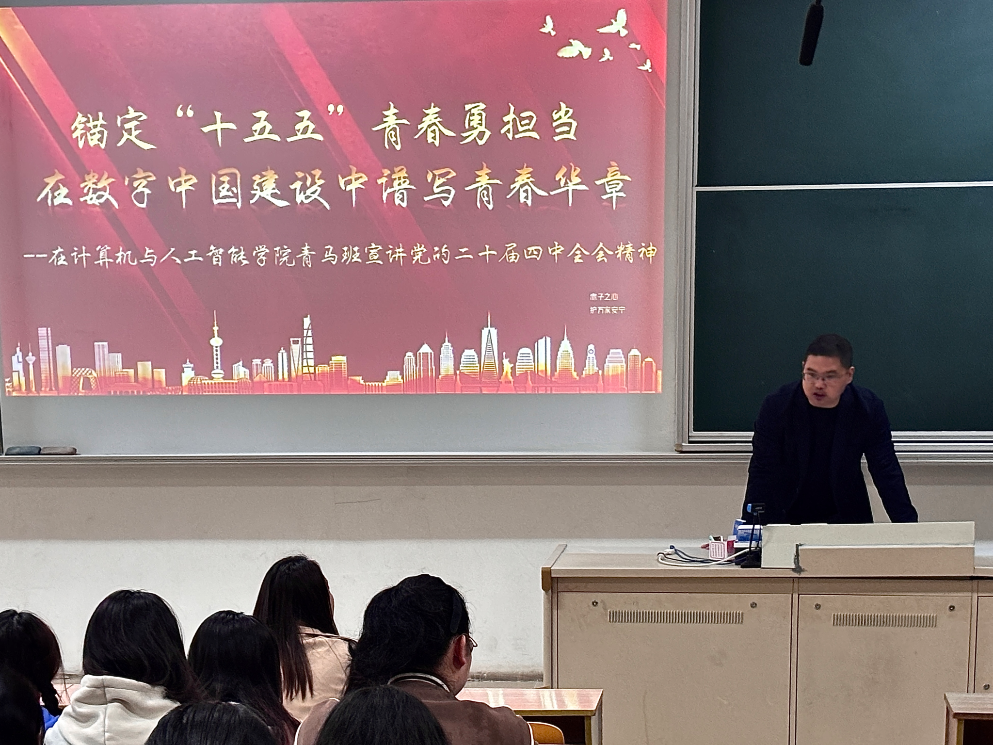 党委副书记马健以《锚定‘十五五’,青春勇担当》为题,从全会召开背景、主要内容与核心精神、重大意义及学院学子践行路径四方面展开。围绕“十五五”规划与数字中国建设的时代背景,结合计算机与人工智能专业特色,引导青马班学员深刻把握全会精神实质,鼓励他们在数字中国建设浪潮中勇担青春使命,以专业本领践行责任担当,为国家发展贡献青春智慧与力量。刚强有力的语言文字让学员们对党的最新理论成果有了更深刻的理解,也为他们锚定了青春奋斗的方向。