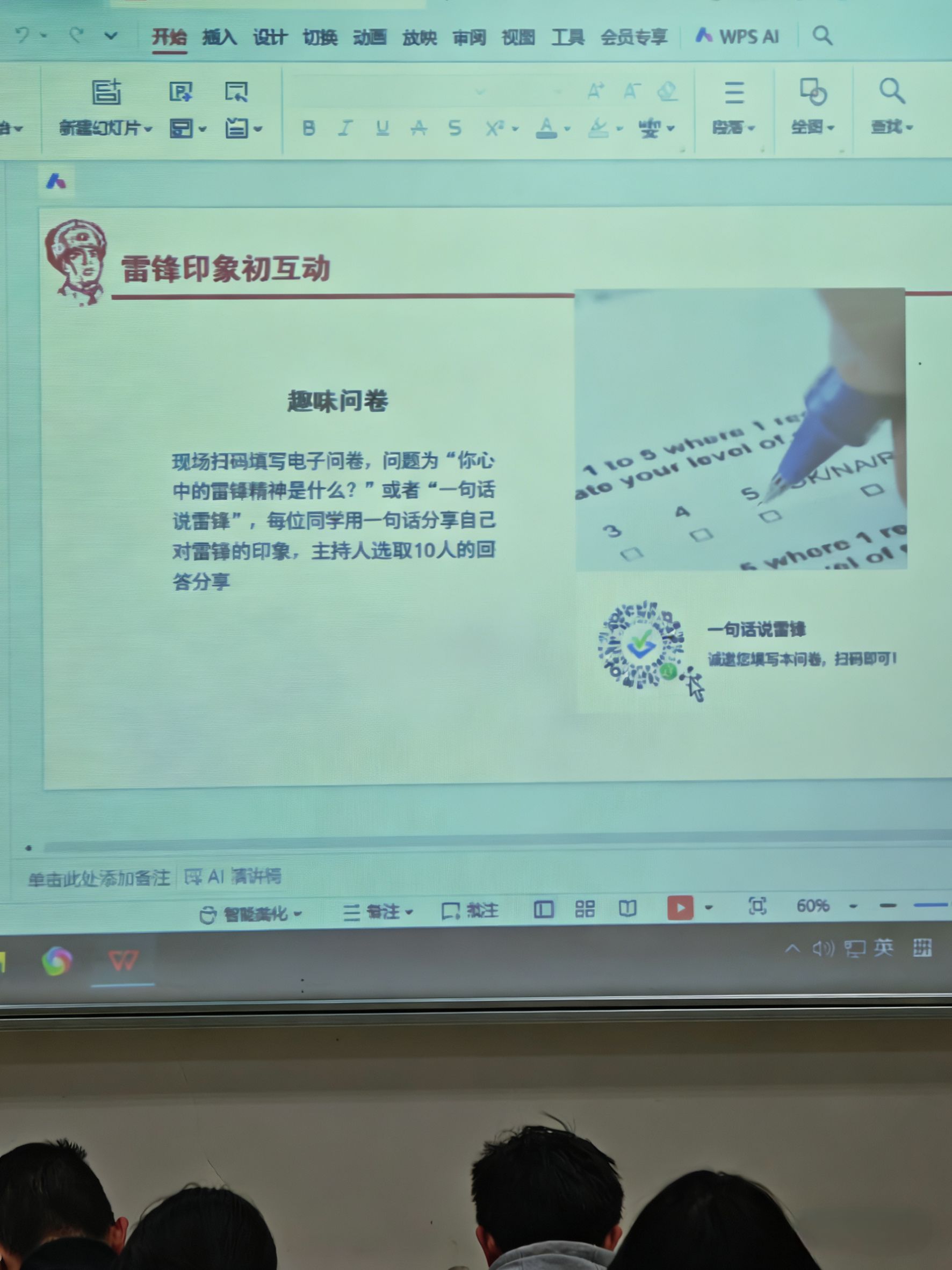 活动开始,主持人带领现场同学重温“向雷锋同志学习”的号召,通过扫码填写“一句话说雷锋”趣味问卷的形式,引导大家表达对雷锋精神的真切理解。同学们积极参与,纷纷写下对雷锋精神的认识与体悟——有的将其凝练为举手之劳的善意,有的则强调默默坚守的担当,还有同学视其为永不褪色的初心。一句句真挚的话语,在互动中勾勒出雷锋精神的多样面貌,也营造出崇尚先进、学习榜样的浓厚氛围。