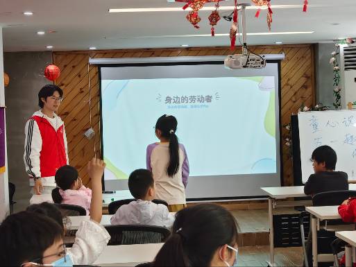 “职业劳动猜猜乐”环节将气氛推向高潮。志愿者依次展示工人、医生、教师、外卖员的职业图片,孩子们瞪大眼睛,争先恐后地举手。“这是医生,他们负责救死扶伤!”“老师!老师不光上课,还要改作业到很晚!”稚嫩的童声里,藏着对劳动者最朴素的敬意。答对的孩子获得小奖品,笑得像花儿一样。在轻松的游戏里,他们对各行各业的劳动者多了份理解与敬意。