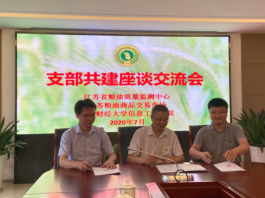 院长、电子商务实验室党支部书记曹杰与江苏粮油质量监测中心支部书记黄熙荣、江苏粮油商品交易市场支部书记高巍现场签订了“党建共建”协议。此次活动以“校企合作,支部共建”为载体,充分发挥党员在校企合作中的作用,对推动政产学研一体化具有重要意义。