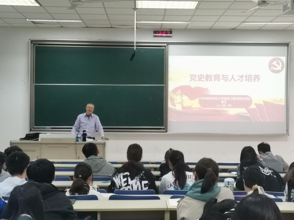 院长、本科生第二支部政治辅导员曹杰教授在德业楼115教室,以“党史教育与人才培养”为题,给2021年下半年“党的发展对象”培训班的学员们上了一堂专题党课。