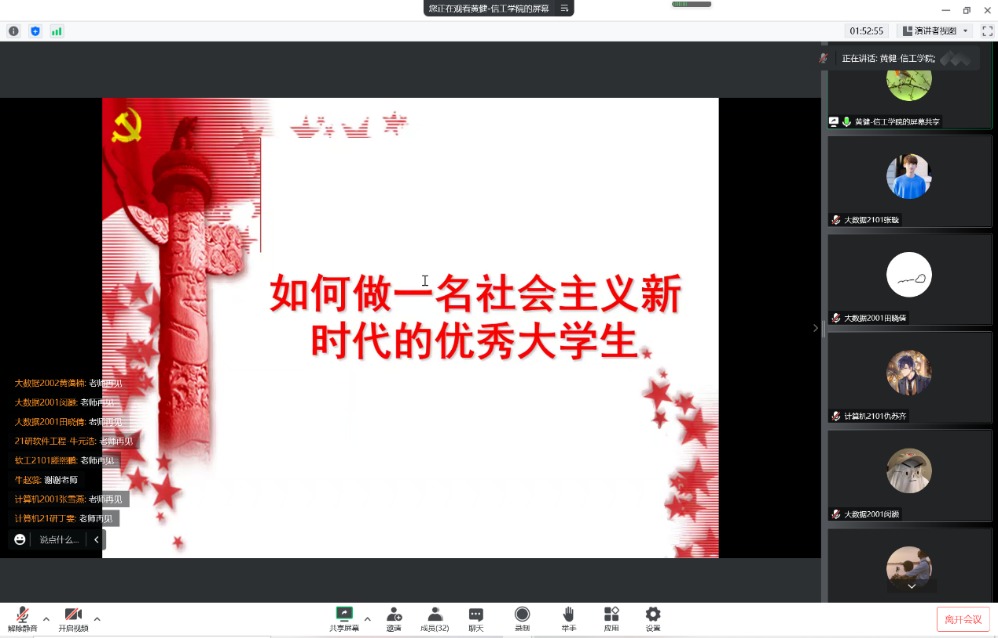 院长、本科生第二党支部政治辅导员黄健教授通过网络平台,以“如何做一名社会主义新时代的优秀大学生”为题,给“党的发展对象”培训班的学员和支部党员上了一堂专题党课。黄院长结合党的二十大报告对青年学生的要求,带领大家一起深刻思考并体会了华中师范大学开学典礼上校长对新生的寄语“立大志,明大德,成大才,担大任”。黄院长在细致讲解了新时代对青年大学生的使命要求后,随机邀请了几名学员讲述他们对于崇高的理想信念,高尚的品格高强的本领才干的理解,对于每一个发言的学员表示了肯定和赞扬。黄院长还分析了古代学子与现代大学生志向的异同之处,邀请了几名学员讲述自己对于“立大志,明大德,成大才,担大任”的理解感悟,并希望新时代的青年大学生要敢为人先,努力做担当民族复兴大任的时代新人。