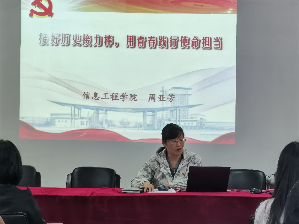 党委书记、本科生第一党支部政治辅导员周亚芳书记在德业楼406会议室,以“接好历史接力棒,用青春践行使命担当”为主题,给“党的发展对象”培训班的学员们和支部党员上了一堂专题党课。周书记基于对党的二十大报告的学习,首先发起生命的意义的思考,指出入党申请书上的初心需要实践,中国梦的实现更需要我们的奋斗。她说,中国共产党的百年奋斗之路,从来没有教科书,更没有标准答案,这是党领导人民独立自主开辟出来的道路。中国在不断的实践学习中,坚定地选择马克思主义道路。党一直坚持理论指导在前,形成马克思主义中国化理论;坚持共产主义的共同理想,敢于斗争,增强全党全国各族人民的底气,实现“四个自信”;坚持初心使命诠释人民至上,坚持全心全意为人民服务,推进同心圆;回溯历史。中国共产党带领人民付出伟大牺牲,也带领人民取得巨大胜利。党把人民装在心里,镌刻在自己的旗帜上。周书记说,在中国共产党的带领下中国已经打赢了脱贫攻坚战,坚持自我革命打破历史周期。面对新时代新格局、纷繁复杂的国际国内局势,和平发展时代存在重重考验,中国将尽最大努力争取和平统一。最后,周书记指出青年同学应当接好历史的接力棒,将历史带来的感悟深刻血液,用青春践行使命担当,用实践证明理想信念,用新的伟大奋斗创造新的伟大胜利。