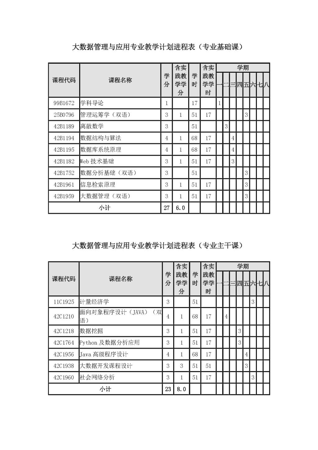 总体课程设置强调数据科学与信息技术的结合和复合应用,具体包括管理运筹学、最优化原理、计量经济学、数据分析基础、大数据存储与处理、大数据管理、大数据分析方法、大数据开发课程设计、大数据安全管理、大数据分析方法、大数据可视化、Python及数据分析应用、信息检索原理、推荐系统导论、现代电子商务网站设计与管理、商务智能与R语言、互联网金融、移动电子商务等。